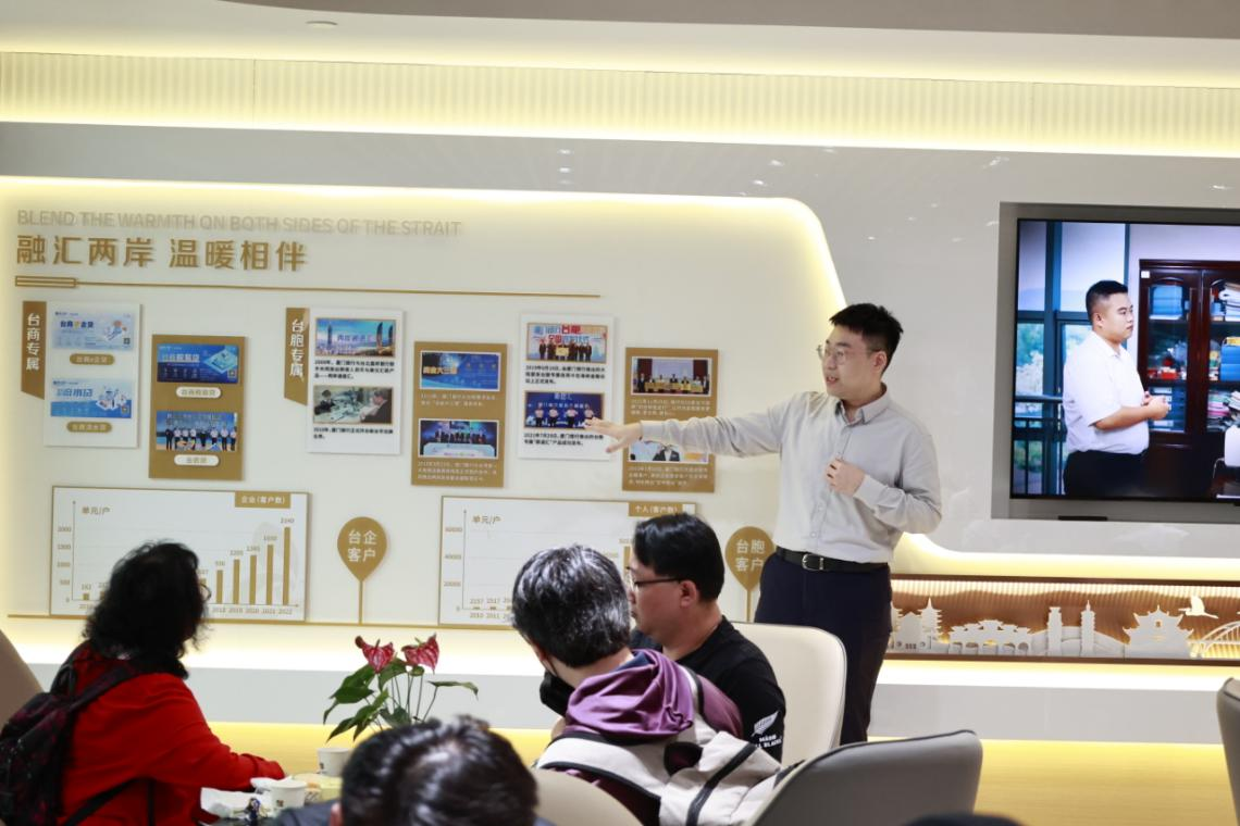 4月25日,臺胞一行參觀廈門銀行南平分行整體布局和“臺商之家”特色服務展廳,了解廈門銀行對臺金融合作、兩岸文化交流等方面推出的特色金融產(chǎn)品,提供的便利化服務和打造亮點活動?,F(xiàn)場,廈門銀行臺籍員工代表向此次來訪的臺胞們分享了在陸工作經(jīng)歷和感受,廈門銀行南平分行行長助理李劍深入跟臺胞交流。