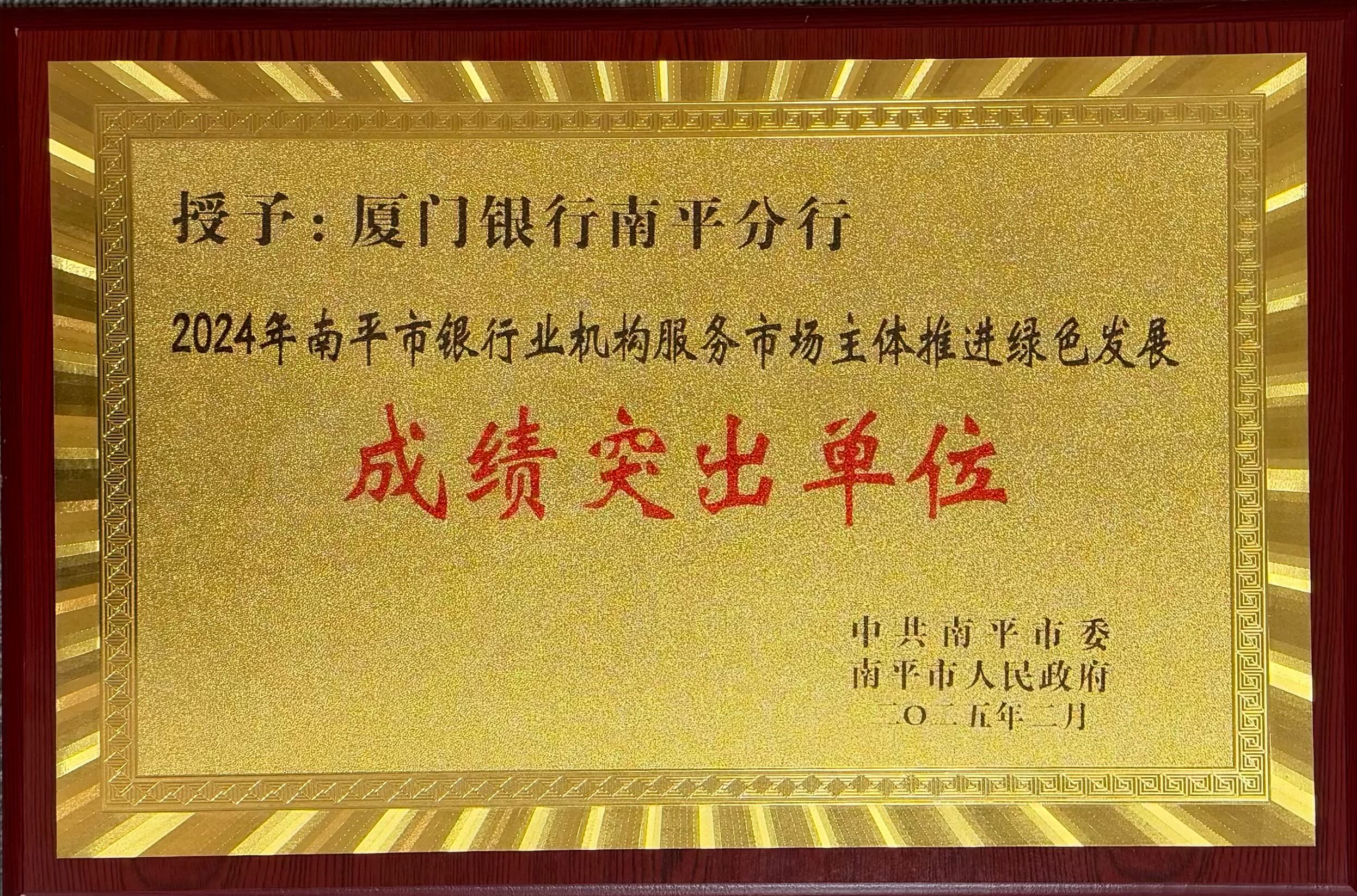 根據(jù)《南平市銀行業(yè)機構(gòu)服務(wù)市場主體推進綠色發(fā)展評價辦法》,經(jīng)綜合評價,廈門銀行南平分行獲評“2024年南平市銀行業(yè)機構(gòu)服務(wù)市場主體推進綠色發(fā)展成績突出單位”。廈門銀行南平分行連續(xù)兩年獲得該項表揚,肯定了我行在南平市銀行業(yè)機構(gòu)服務(wù)市場主體、推進綠色發(fā)展工作中取得優(yōu)異表現(xiàn),也激勵著我行繼續(xù)為南平市全方位綠色高質(zhì)量發(fā)展做出更多貢獻(xiàn)。