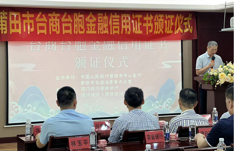 儀式現(xiàn)場(chǎng),中國(guó)人民銀行莆田市中心支行副行長(zhǎng)康志強(qiáng)先生、莆田市臺(tái)港澳事務(wù)辦公室副主任倪建軍先生分別致辭并為到場(chǎng)臺(tái)胞頒發(fā)金融信用證書,廈門銀行莆田分行行長(zhǎng)謝曉明先生、廈門銀行總行臺(tái)商部總經(jīng)理助理李清偉先生、廈門銀行莆田分行行長(zhǎng)助理傅健民先生、莆田市農(nóng)行、市建行、市郵儲(chǔ)銀行分管行領(lǐng)導(dǎo)及牽頭部門負(fù)責(zé)人、湄洲祖廟莆田會(huì)館館長(zhǎng)陳金森先生、中國(guó)人民銀行莆田市中心支行征信管理科副科長(zhǎng)林玉平先生及客戶臺(tái)胞共約50余人參加本次活動(dòng)。