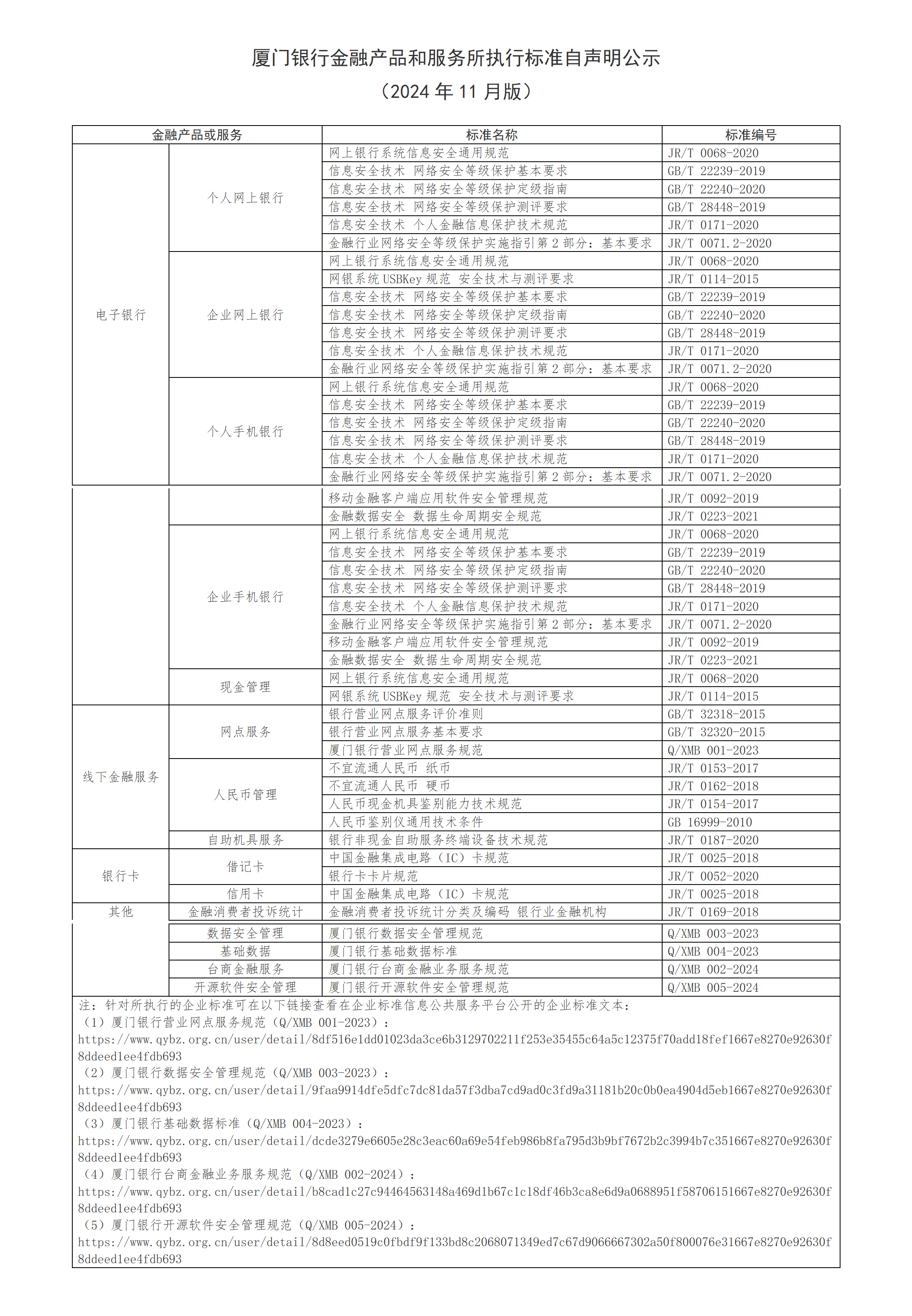 廈門(mén)銀行金融產(chǎn)品和服務(wù)所執(zhí)行標(biāo)準(zhǔn)自聲明公示(2024年11月)