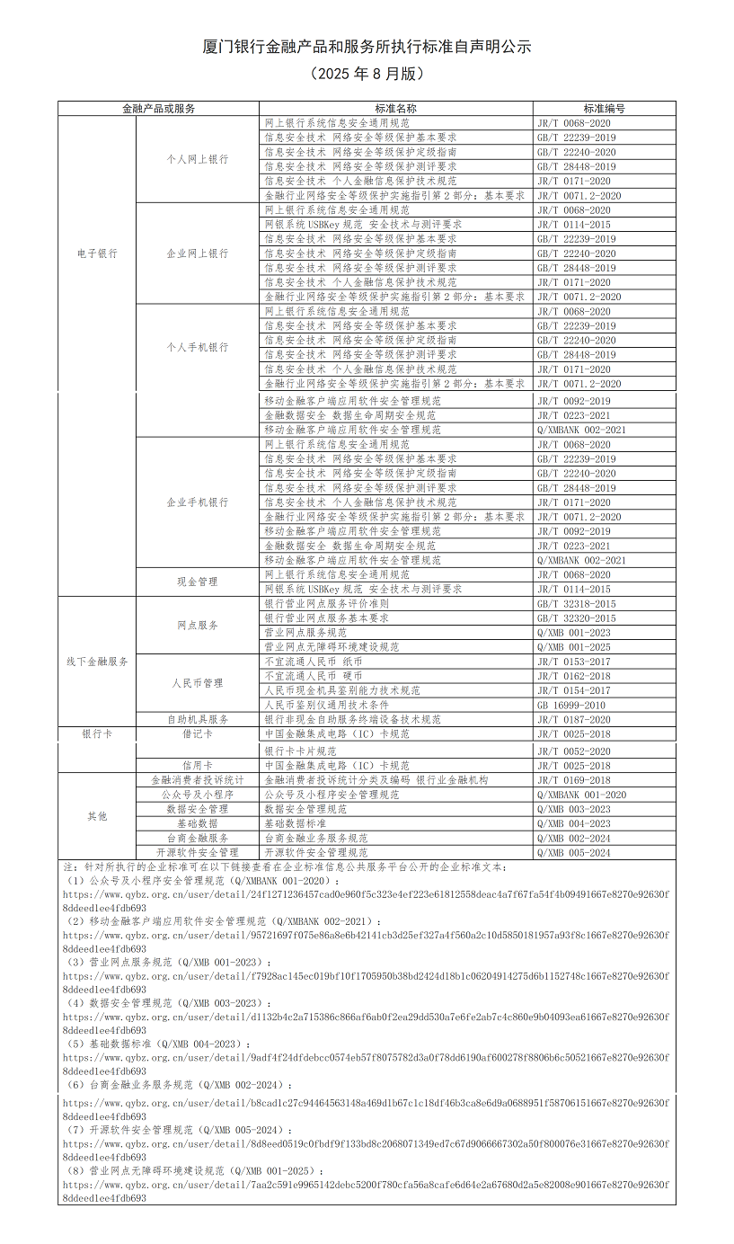 廈門銀行金融產(chǎn)品和服務所執(zhí)行標準自聲明公示(2025年8月)