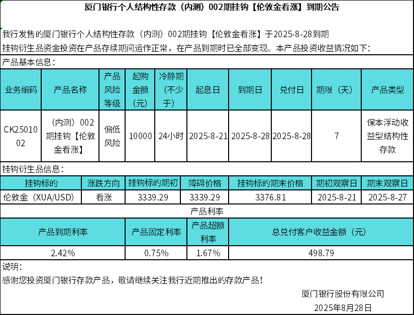 廈門銀行個人結(jié)構(gòu)性存款(內(nèi)測)002期掛鉤【倫敦金看漲】到期公告