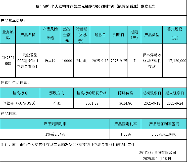 廈門銀行個人結構性存款二元觸發(fā)型008期掛鉤【倫敦金看漲】成立公告 日期:2025-09-18 16:35:33 廈門銀行個人結構性存款二元觸發(fā)型008期掛鉤【倫敦金看漲】銷售文件.zip 返回 下一篇