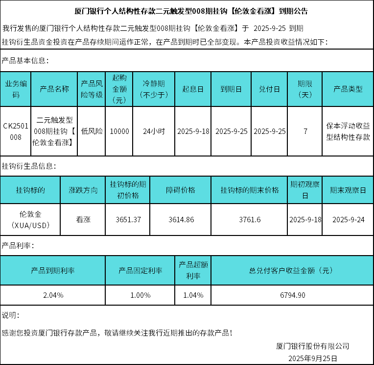 廈門銀行個(gè)人結(jié)構(gòu)性存款二元觸發(fā)型008期掛鉤【倫敦金看漲】到期公告