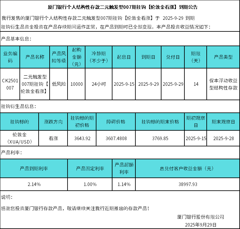 廈門銀行個人結(jié)構(gòu)性存款二元觸發(fā)型007期掛鉤【倫敦金看漲】到期公告