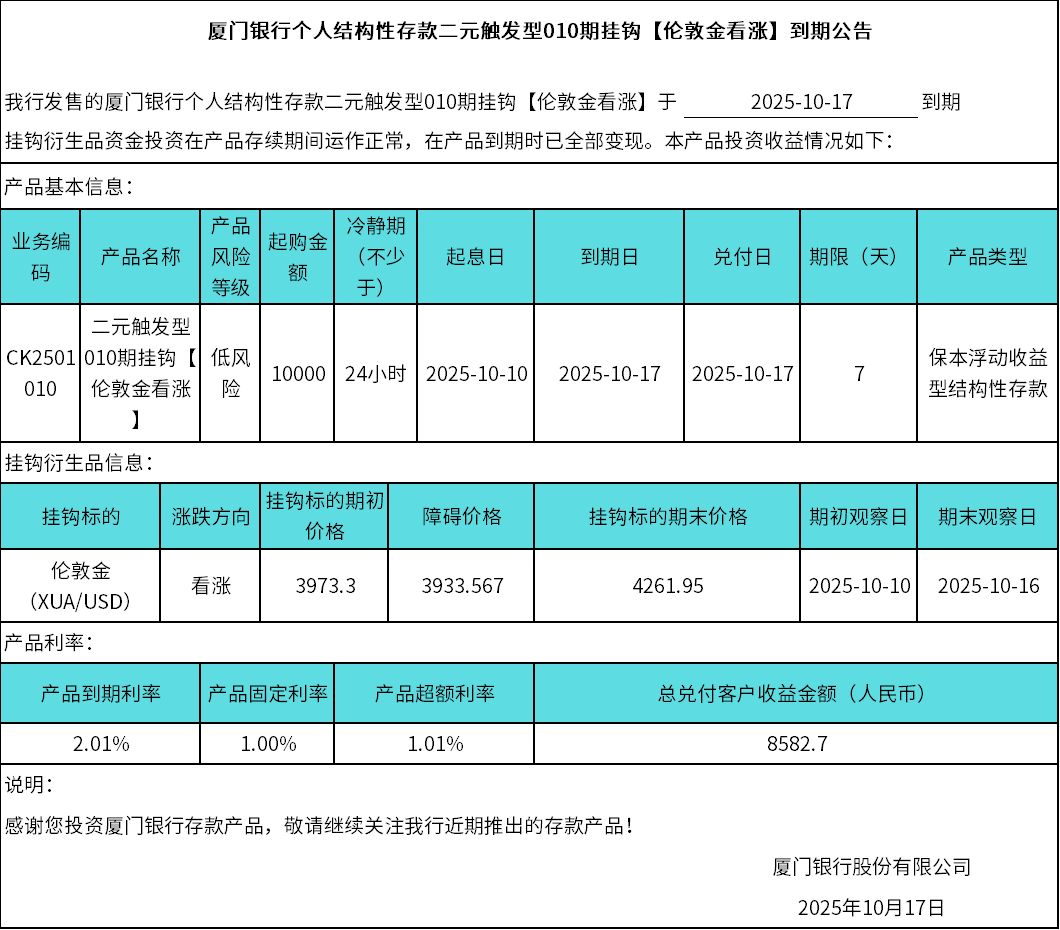 廈門銀行個人結構性存款二元觸發(fā)型010期掛鉤【倫敦金看漲】到期公告