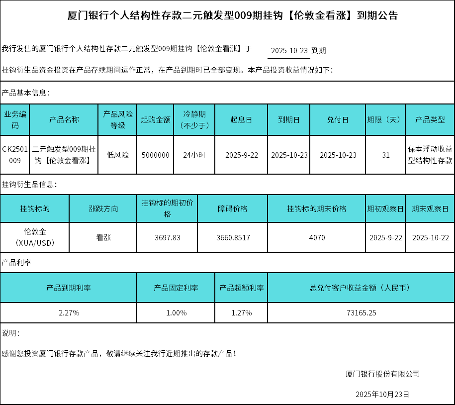 廈門銀行個(gè)人結(jié)構(gòu)性存款二元觸發(fā)型009期掛鉤【倫敦金看漲】到期公告