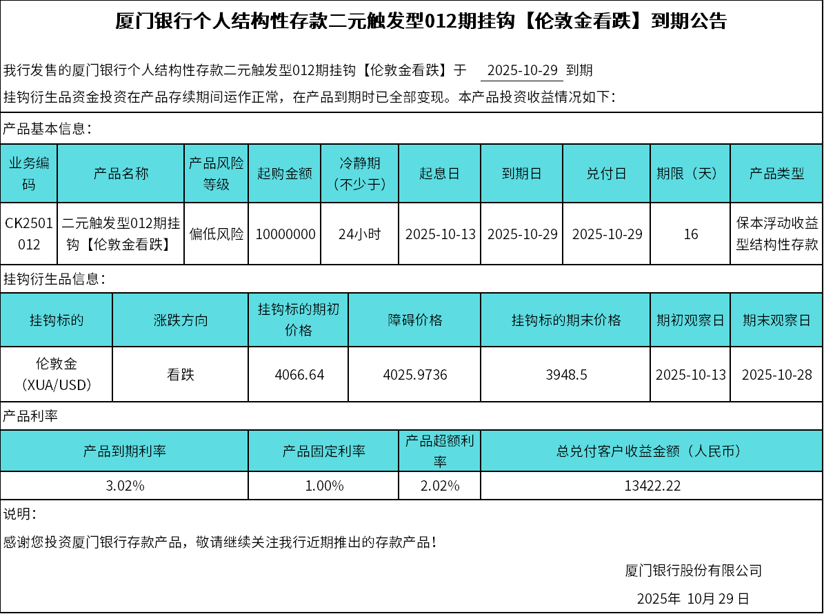 廈門(mén)銀行個(gè)人結(jié)構(gòu)性存款二元觸發(fā)型012期掛鉤【倫敦金看跌】到期公告