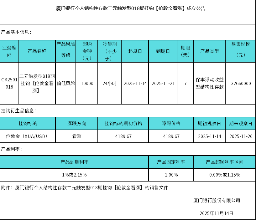 廈門銀行個人結(jié)構(gòu)性存款二元觸發(fā)型018期掛鉤【倫敦金看張】成立公告 日期:2025-11-14 15:04:33 廈門銀行個人結(jié)構(gòu)性存款二元觸發(fā)型018期掛鉤【倫敦金看漲】銷售文件.zip 上一篇 返回 下一篇