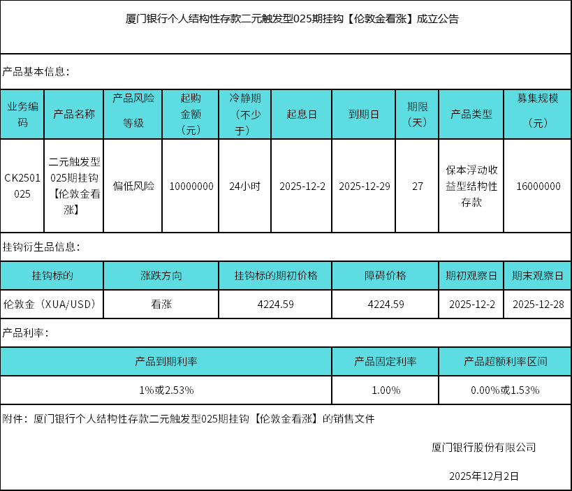 廈門銀行個(gè)人結(jié)構(gòu)性存款二元觸發(fā)型025期掛鉤【倫敦金看漲】成立公告 日期:2025-12-02 15:41:46 廈門銀行個(gè)人結(jié)構(gòu)性存款二元觸發(fā)型025期掛鉤【倫敦金看漲】銷售文件.zip 返回 下一篇
