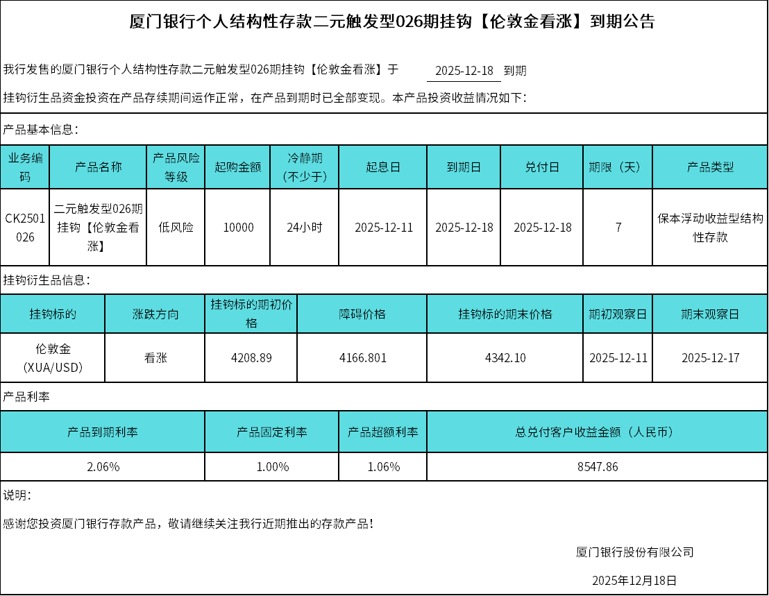 廈門銀行個人結構性存款二元觸發(fā)型026期掛鉤【倫敦金看漲】到期公告
