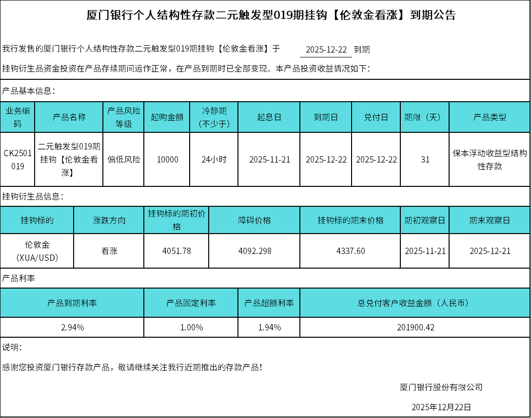 廈門銀行個人結(jié)構(gòu)性存款二元觸發(fā)型019期掛鉤【倫敦金看漲】到期公告