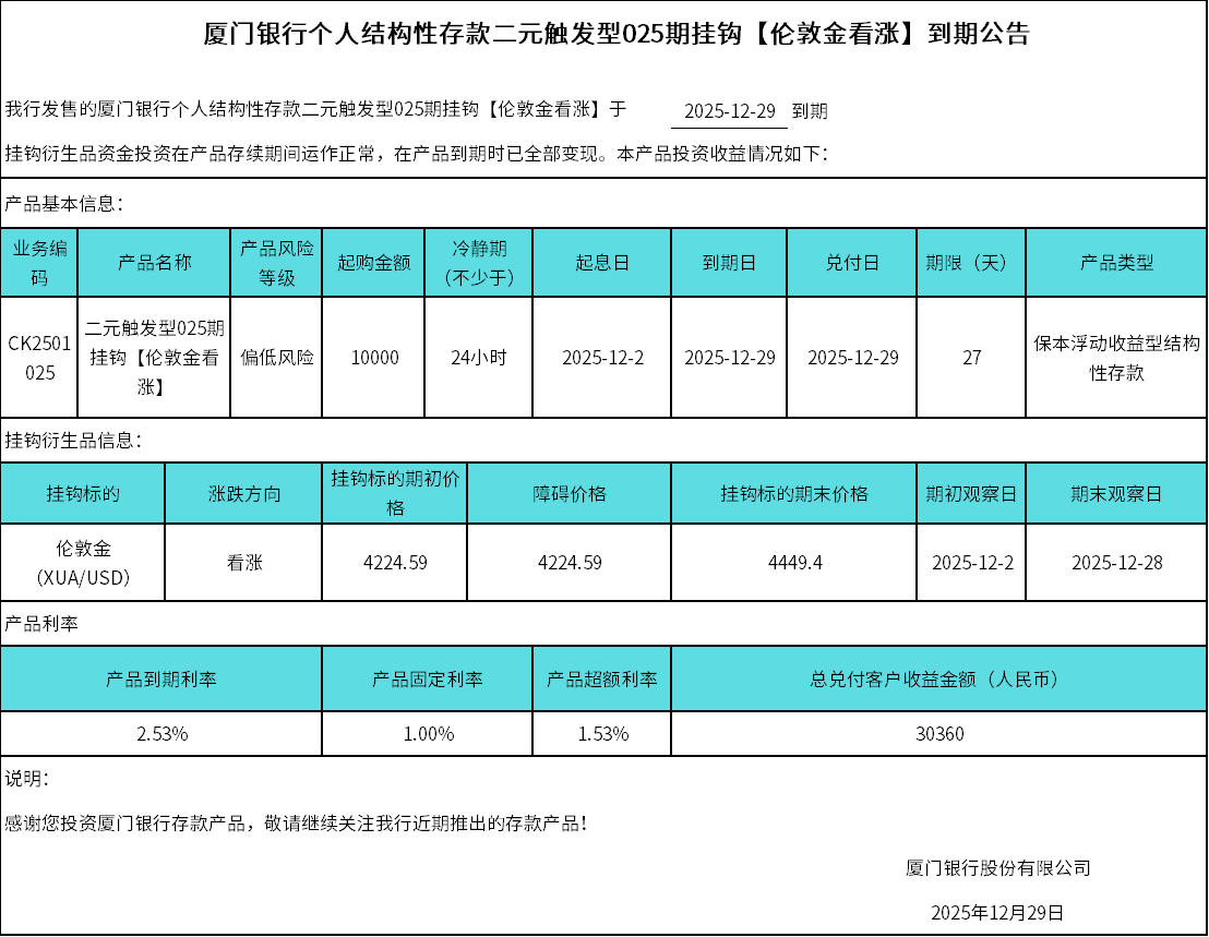 廈門銀行個人結構性存款二元觸發(fā)型025期掛鉤【倫敦金看漲】到期公告