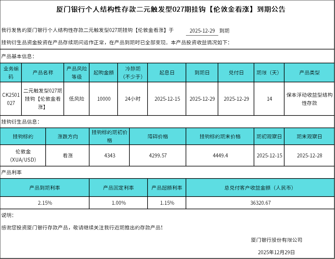 廈門銀行個(gè)人結(jié)構(gòu)性存款二元觸發(fā)型027期掛鉤【倫敦金看漲】到期公告