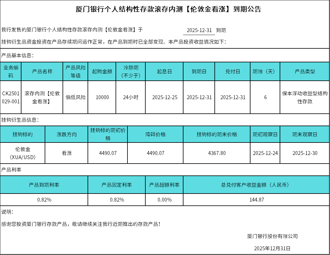 廈門銀行個人結構性存款滾存內(nèi)測【倫敦金看漲】到期公告