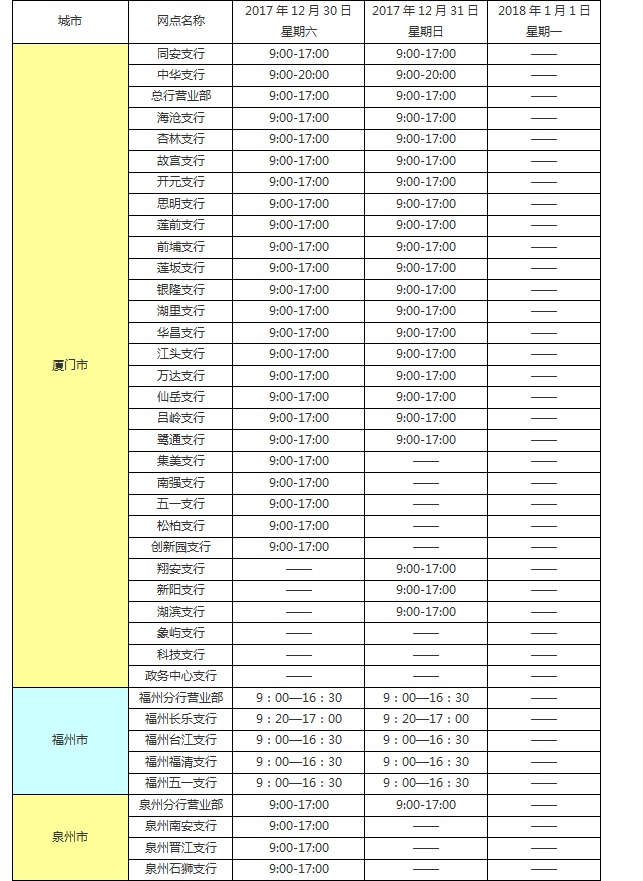 廈門銀行2018年元旦假期網(wǎng)點營業(yè)時間通告