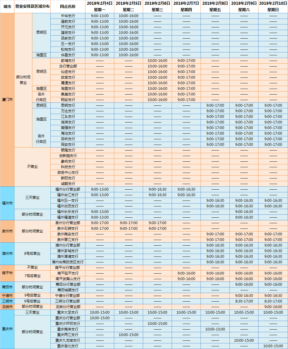 您好!根據(jù)國務(wù)院辦公廳有關(guān)通知精神,廈門銀行2019年春節(jié)放假具體時間安排如下:2019年2月4日(星期一)至2019年2月10日(星期日)共7天;2月11日(星期一)上班?,F(xiàn)就2019年春節(jié)放假期間營業(yè)網(wǎng)點(diǎn)安排事項(xiàng)通知如下: