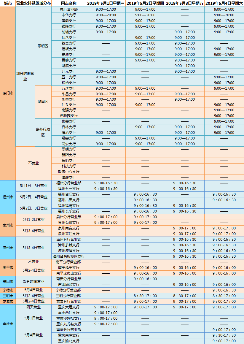 廈門銀行2019年勞動節(jié)假期網(wǎng)點營業(yè)時間通告