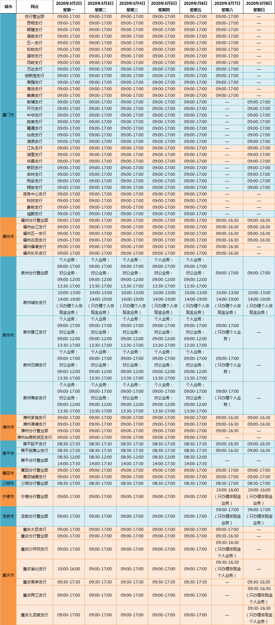 廈門銀行2020年3月2日-3月8日各網(wǎng)點(diǎn)營業(yè)時(shí)間安排的通知