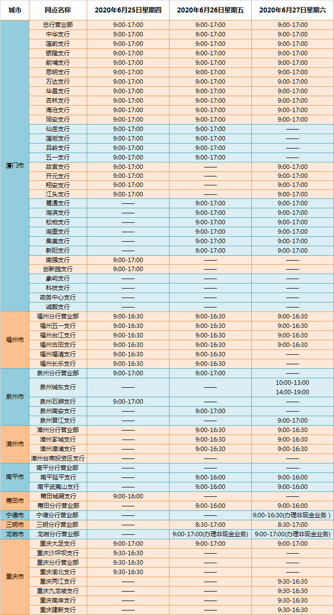 廈門銀行2020端午節(jié)假期網(wǎng)點對外營業(yè)時間通告