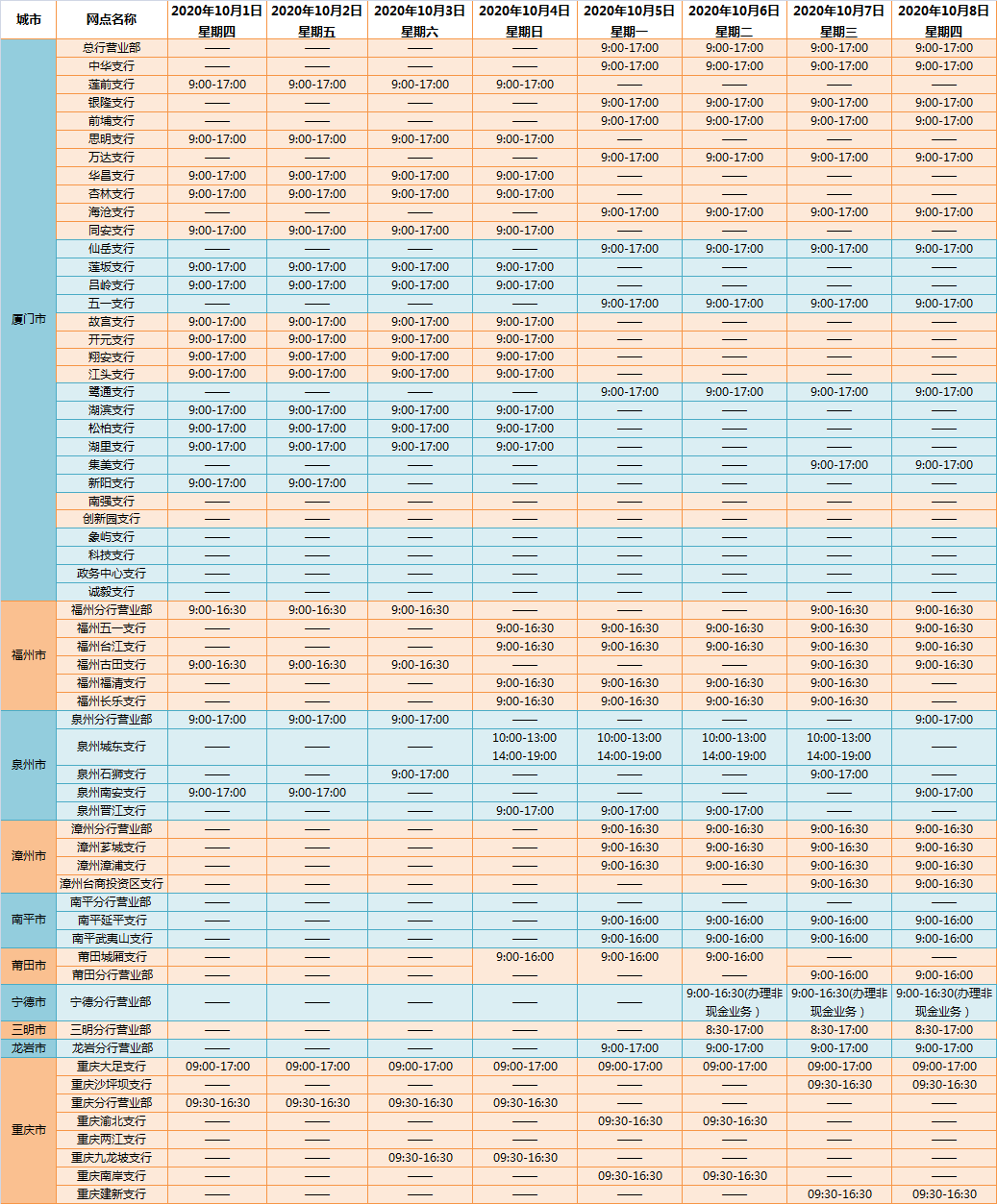 廈門銀行2020國慶中秋假期網(wǎng)點對外營業(yè)時間通告