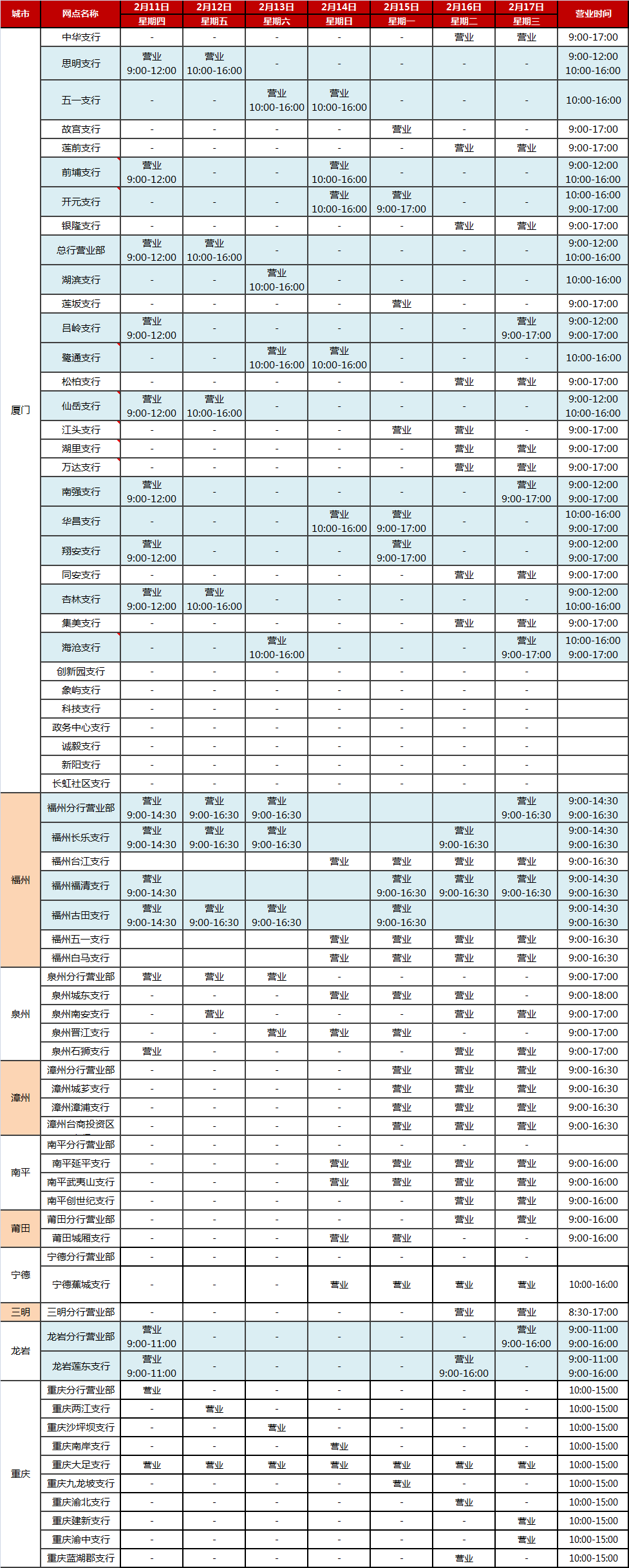 廈門銀行2021年春節(jié)假期網(wǎng)點(diǎn)對外營業(yè)時間通告