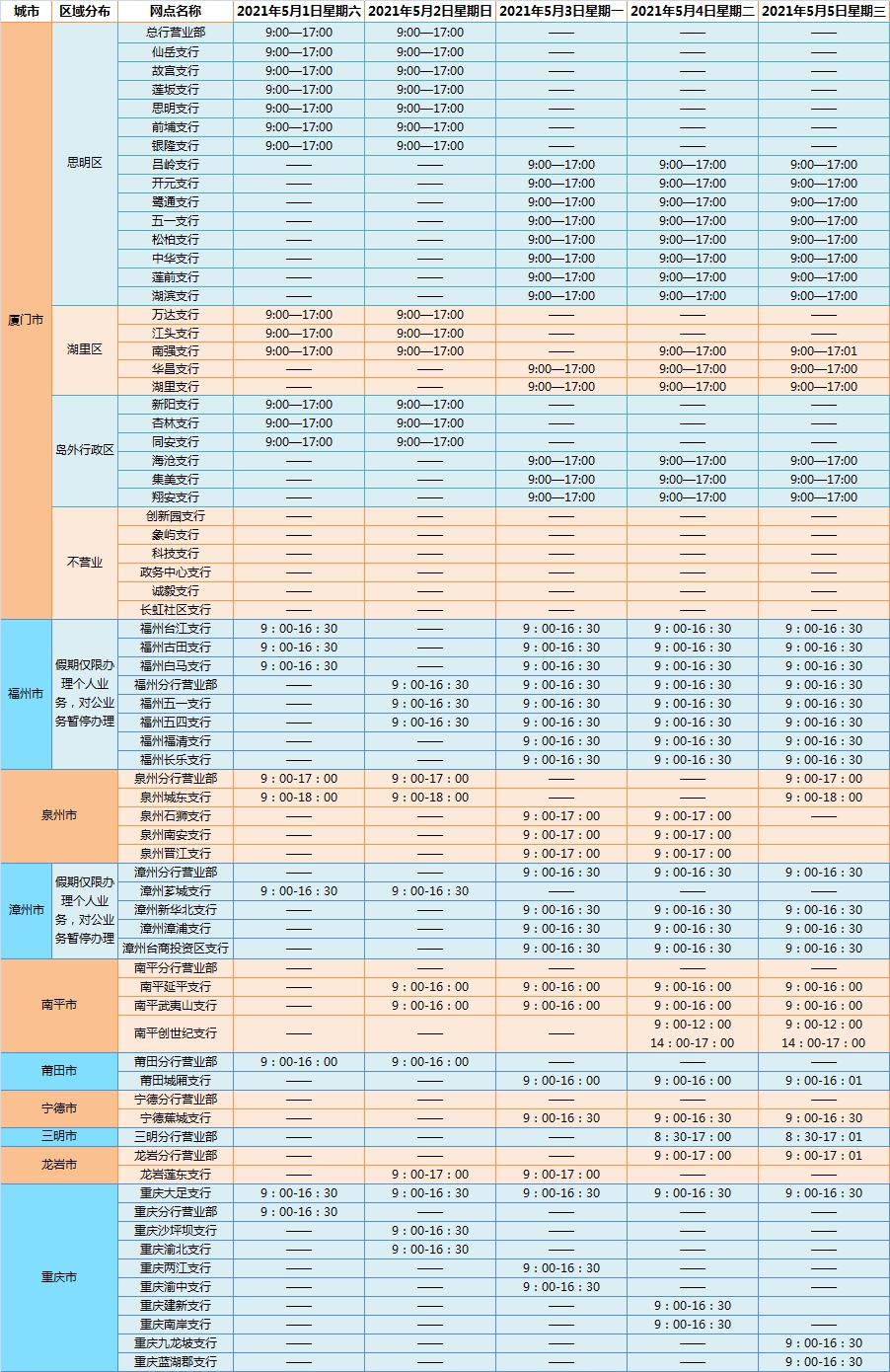 廈門銀行2021年勞動(dòng)節(jié)假期網(wǎng)點(diǎn)對(duì)外營(yíng)業(yè)時(shí)間通告
