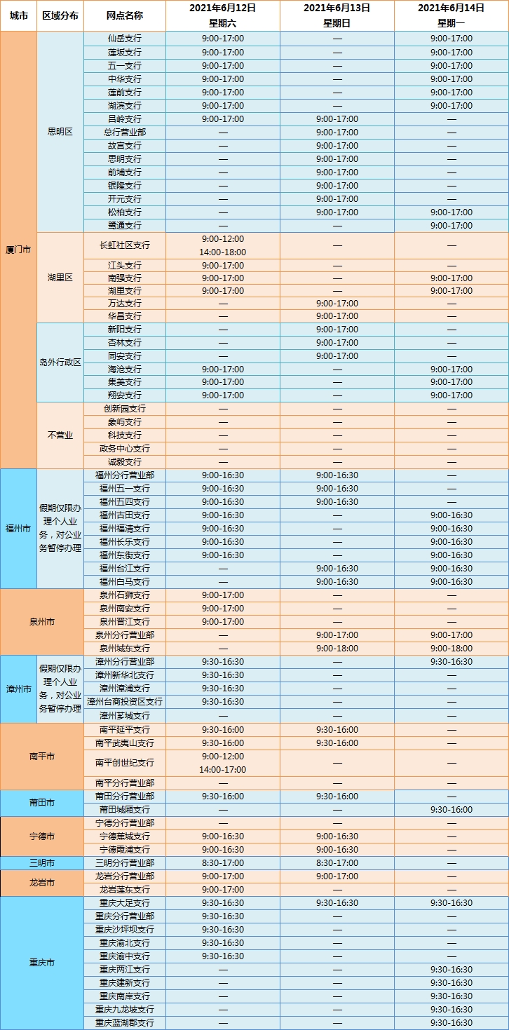 廈門銀行2021年端午節(jié)假期網(wǎng)點(diǎn)對(duì)外營業(yè)時(shí)間通告