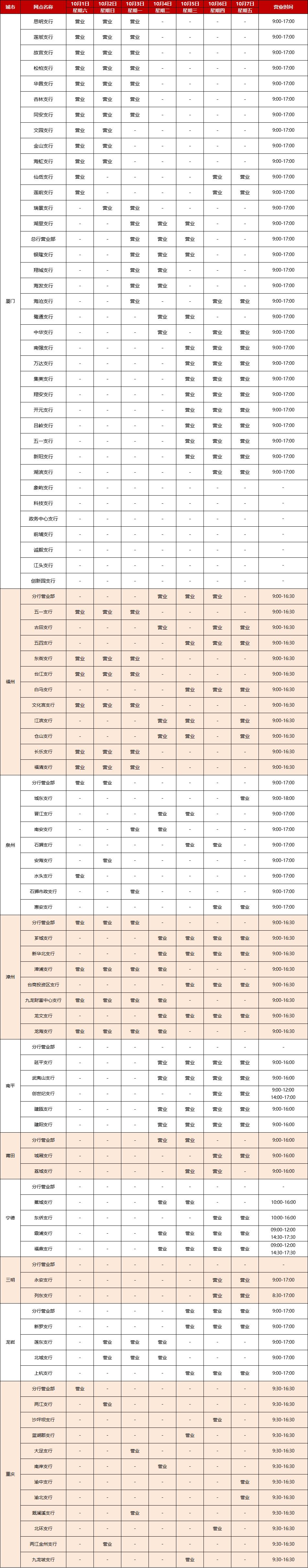 廈門銀行2022國慶節(jié)假期網(wǎng)點(diǎn)對(duì)外營業(yè)時(shí)間通告