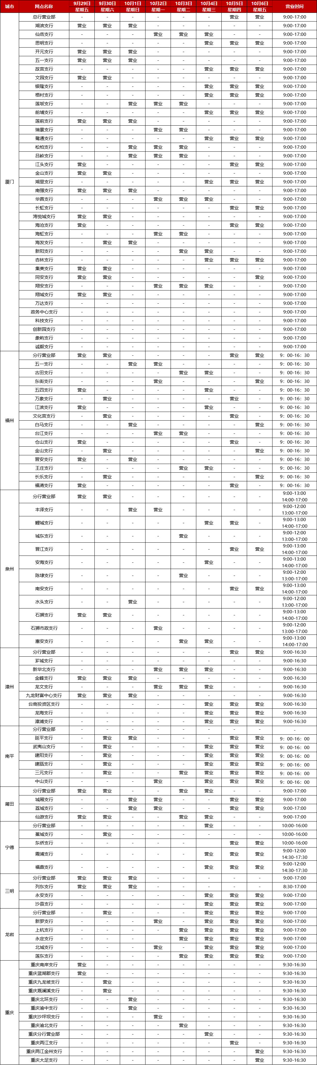 廈門銀行2023年中秋節(jié)、國慶節(jié)假期網(wǎng)點對外營業(yè)時間通告