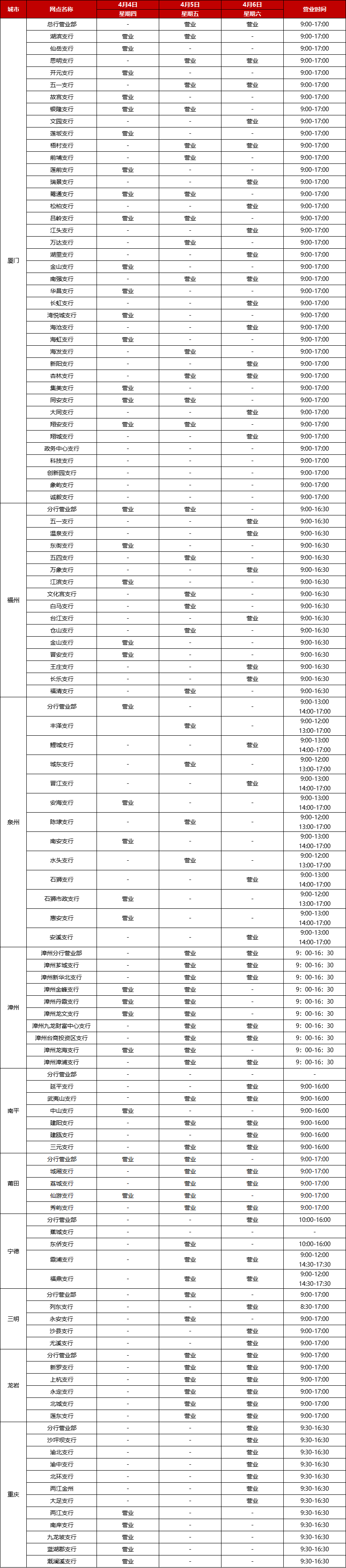 廈門銀行2024年清明節(jié)假期網點對外營業(yè)時間通告