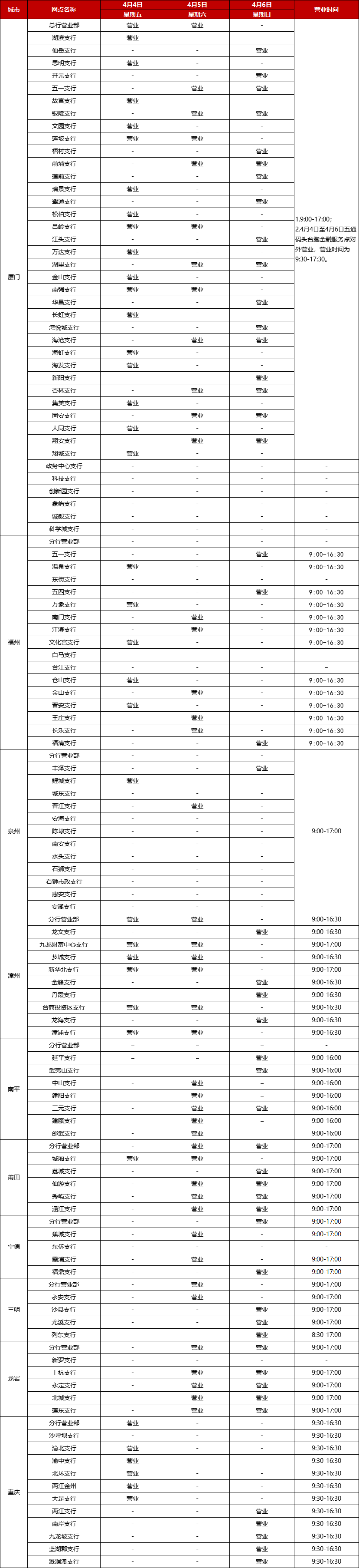 廈門銀行2025年清明節(jié)假期網點對外營業(yè)時間通告