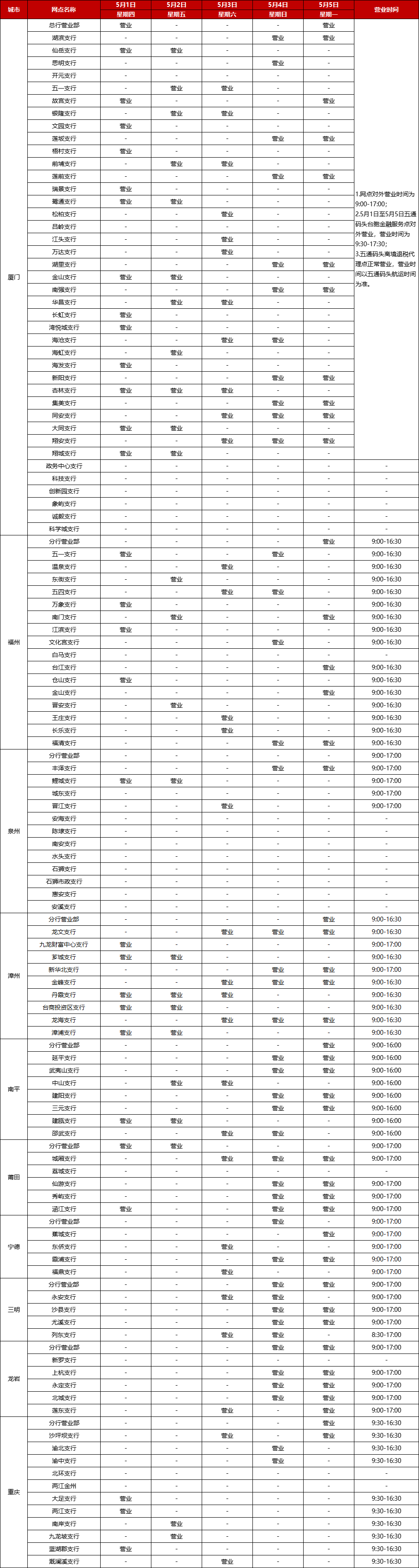 廈門(mén)銀行2025年勞動(dòng)節(jié)假期網(wǎng)點(diǎn)對(duì)外營(yíng)業(yè)時(shí)間通告