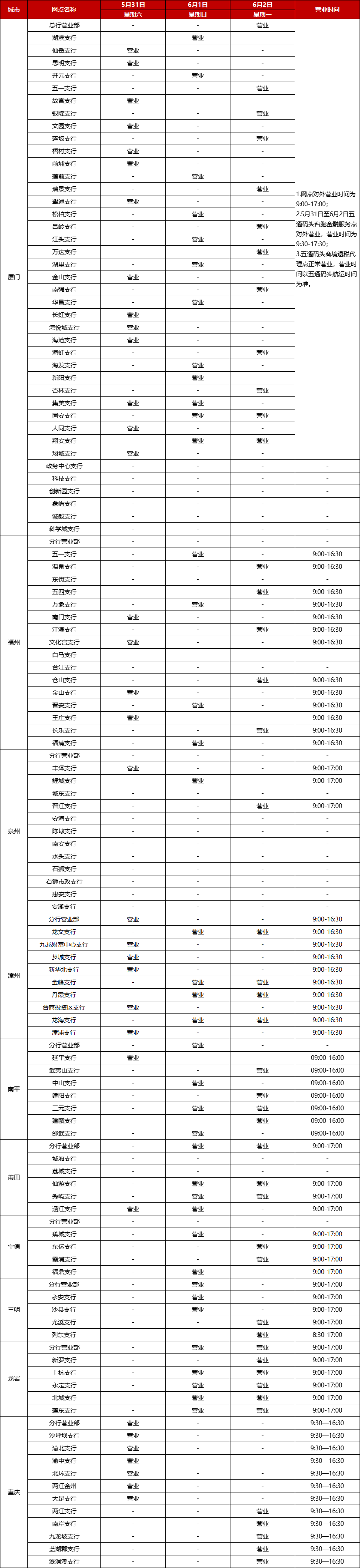 廈門銀行2025年端午節(jié)假期網(wǎng)點(diǎn)對(duì)外營(yíng)業(yè)時(shí)間通告
