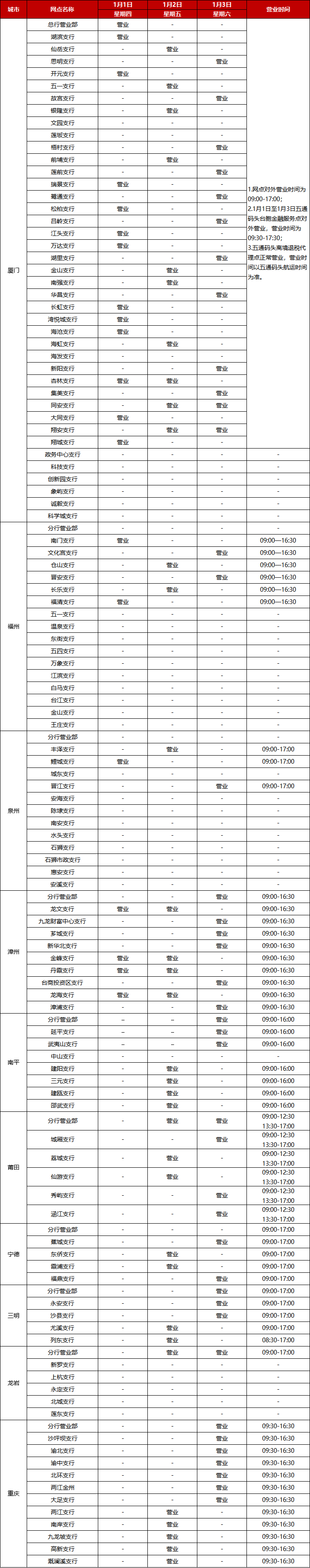 廈門銀行2026年元旦假期網(wǎng)點對外營業(yè)時間通告
