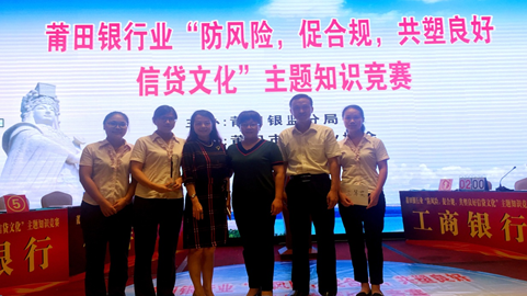 2017年9月28日,莆田分行參加由莆田市銀監(jiān)分局主辦,莆田市銀行業(yè)協(xié)會(huì)、莆田市金融團(tuán)工委協(xié)辦的“防風(fēng)險(xiǎn) 促合規(guī) 共塑良好信貸文化” 主題知識(shí)競賽決賽。分行代表隊(duì)表現(xiàn)優(yōu)異,榮獲團(tuán)體三等獎(jiǎng)的好成績。主辦方還對(duì)初賽筆試的個(gè)人前五名進(jìn)行了頒獎(jiǎng),分行綜合管理部林揚(yáng)華獲得個(gè)人優(yōu)勝獎(jiǎng)。