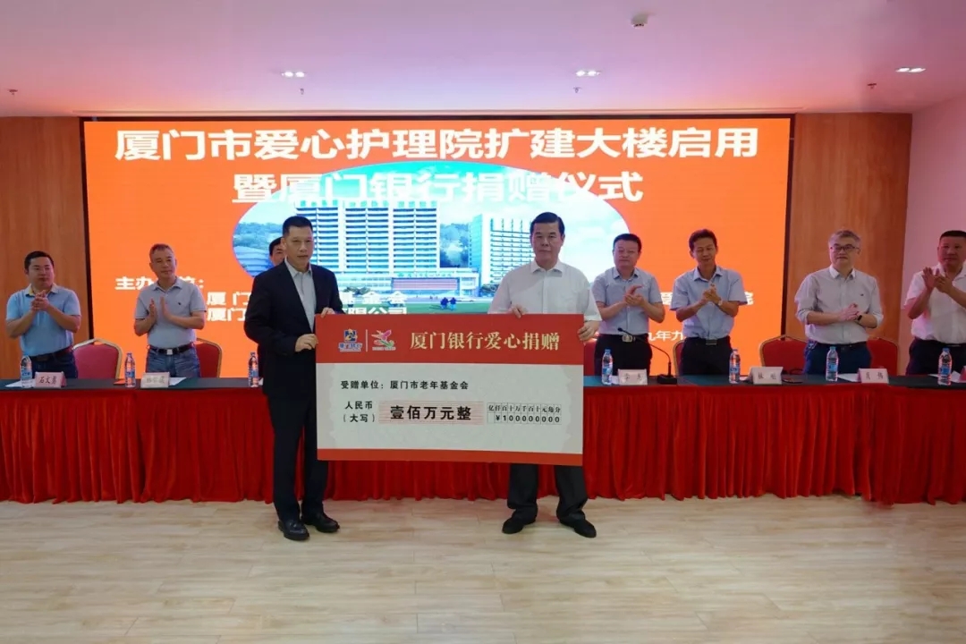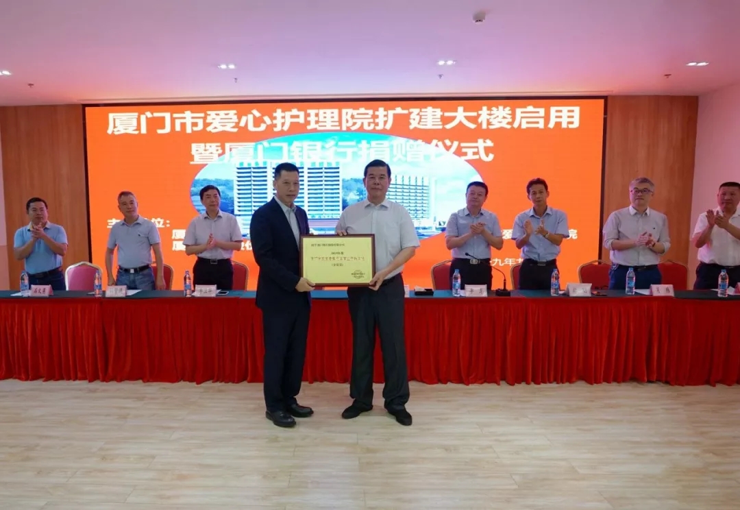2019年10月16日,廈門市愛心護(hù)理院擴(kuò)建大樓啟用暨廈門銀行捐贈儀式溫馨舉辦,廈門銀行再度為“廈門銀行特困老人救助基金”捐贈100萬元。老年基金會代會長李建福向廈門銀行吳世群董事長授予“2019年度廈門市發(fā)展老年慈善事業(yè)貢獻(xiàn)單位(金質(zhì)獎)”牌匾。