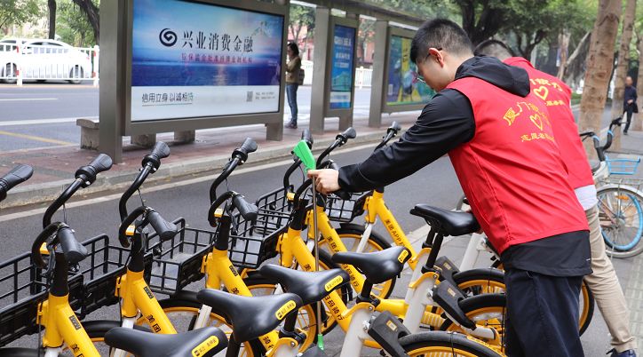 志愿者將共享單車進(jìn)行規(guī)整擺放。