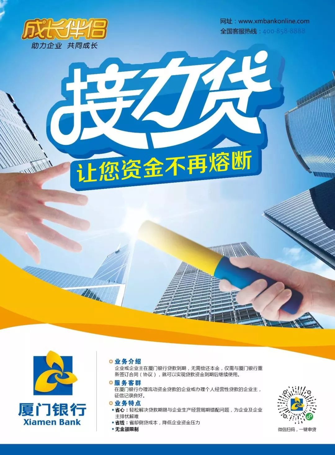 “接力貸”是廈門銀行在廈門銀保監(jiān)局的指導(dǎo)與支持下,秉持“完善和創(chuàng)新小微企業(yè)貸款服務(wù),提高小微企業(yè)金融服務(wù)水平”的宗旨推出的無縫續(xù)貸產(chǎn)品。