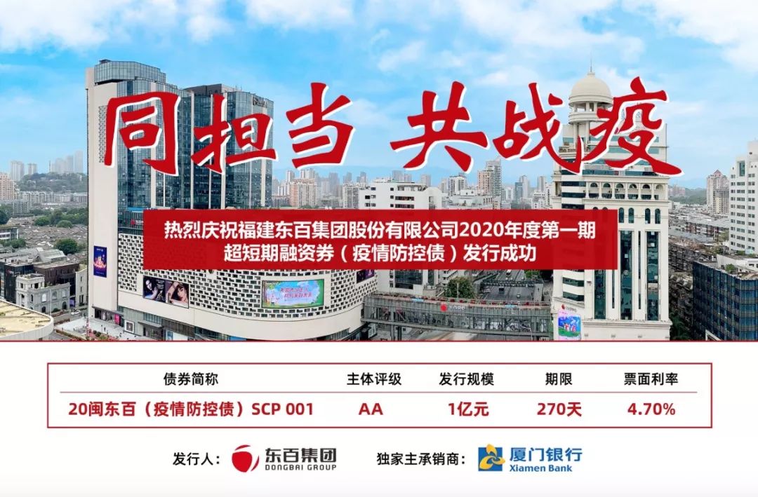 福建東百集團(tuán)股份有限公司2020年度第一期超短期融資券(疫情防控債)于2020年2月18日成功簿記發(fā)行,票面利率4.7%,創(chuàng)企業(yè)發(fā)行票面利率新低。