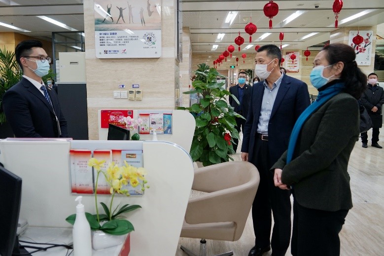 王主任一行經(jīng)過(guò)紅外線(xiàn)智能體溫檢測(cè)、使用免洗洗手液進(jìn)行手部消毒后,對(duì)我行的防疫設(shè)施給予肯定。隨后,王主任一行在吳世群董事長(zhǎng)的陪同下來(lái)到總行營(yíng)業(yè)部,并對(duì)客戶(hù)進(jìn)入銀行營(yíng)業(yè)廳的流程做了了解。