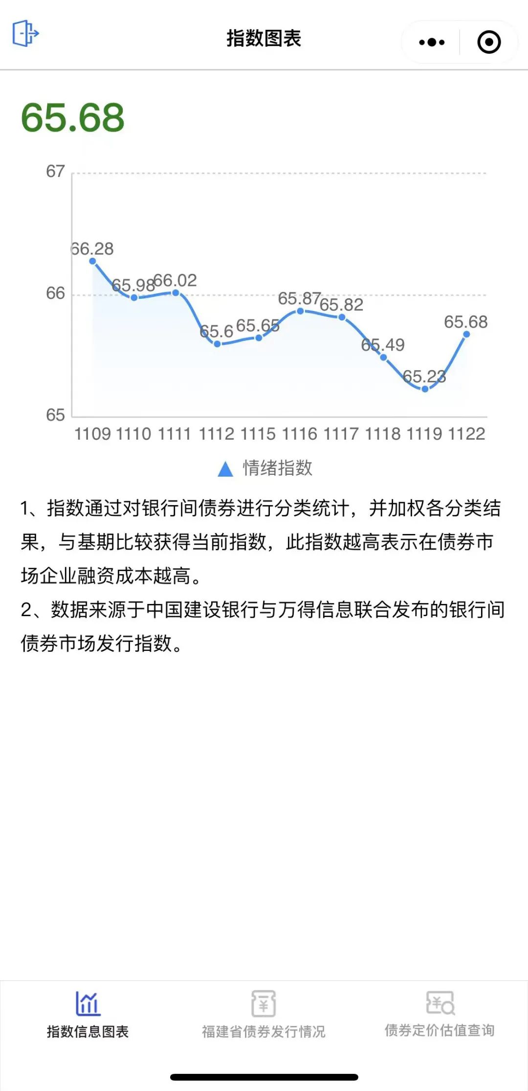 提供實(shí)時(shí)的市場資金情緒指數(shù)查詢,指數(shù)越低表示在債券市場企業(yè)融資成本越低,讓發(fā)債客戶可以及時(shí)把握市場資金成本較低的時(shí)點(diǎn),選擇較好的債券發(fā)行窗口時(shí)間。