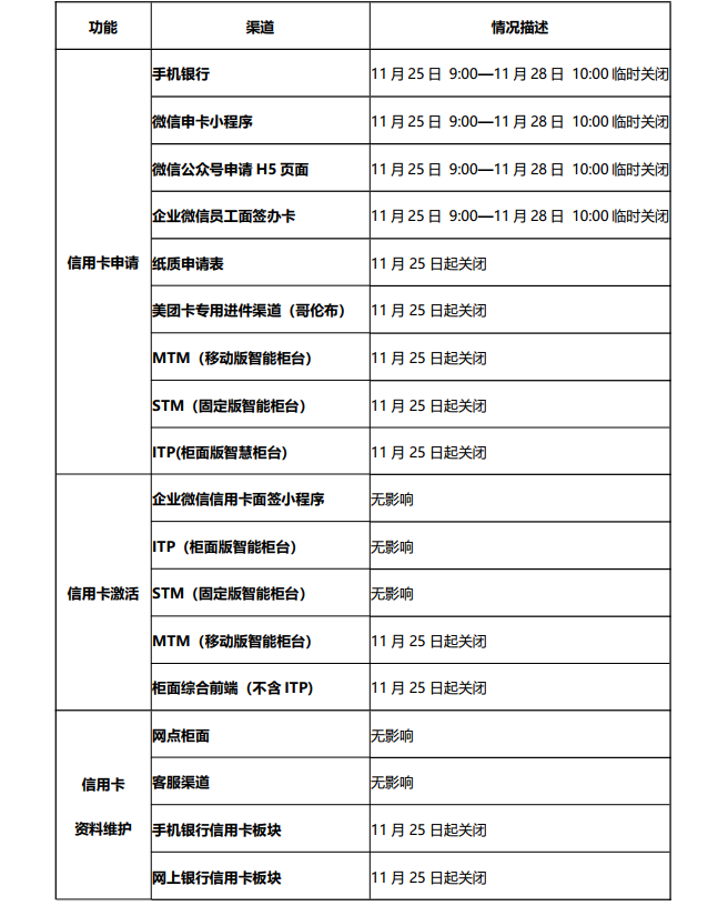為給您提供更優(yōu)質(zhì)的服務(wù),我行將于2022年11月25日起調(diào)整信用卡申請(qǐng)、激活、信息維護(hù)的相關(guān)渠道,變更內(nèi)容詳見下表: